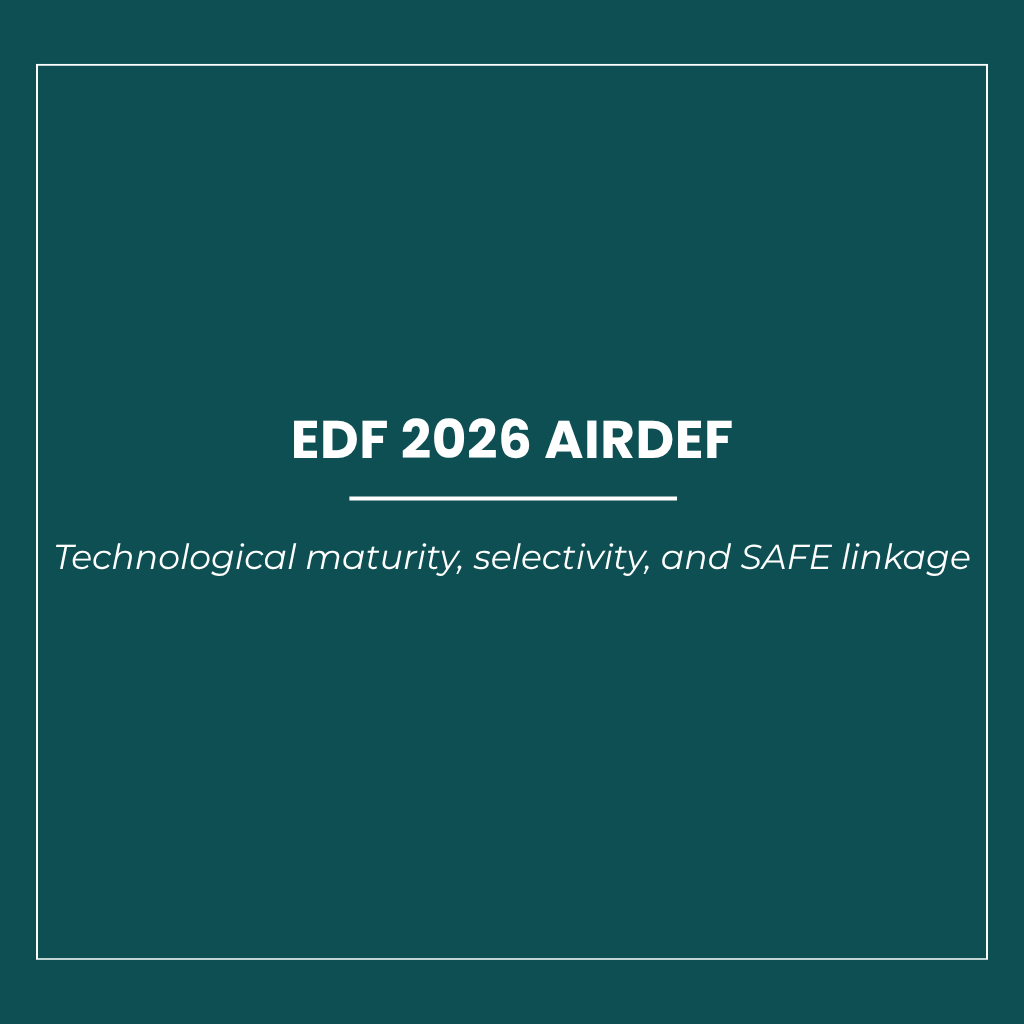 The report is structured to test that proposition against documentary evidence rather than institutional rhetoric. It begins by reconstructing the legal, budgetary, and programmatic baseline from EDF, SAFE, EDA, and company primary sources, keeping strictly separate what is law in force, what is programme design, what is planning intent, and what is only company positioning. It then develops an analytical reading of the 2026 AIRDEF configuration, focusing on technological maturation, the gap between formal eligibility and the realistic applicant pool, the conditional relationship between EDF development lines and future SAFE-relevant procurement, and the industrial categories most structurally aligned with the call design. A third part examines the implications for investors, prime contractors, procurement specialists, and EU policymakers, before a final section identifies the concrete signals that would strengthen, weaken, or revise the report’s conclusions over the next twelve months.