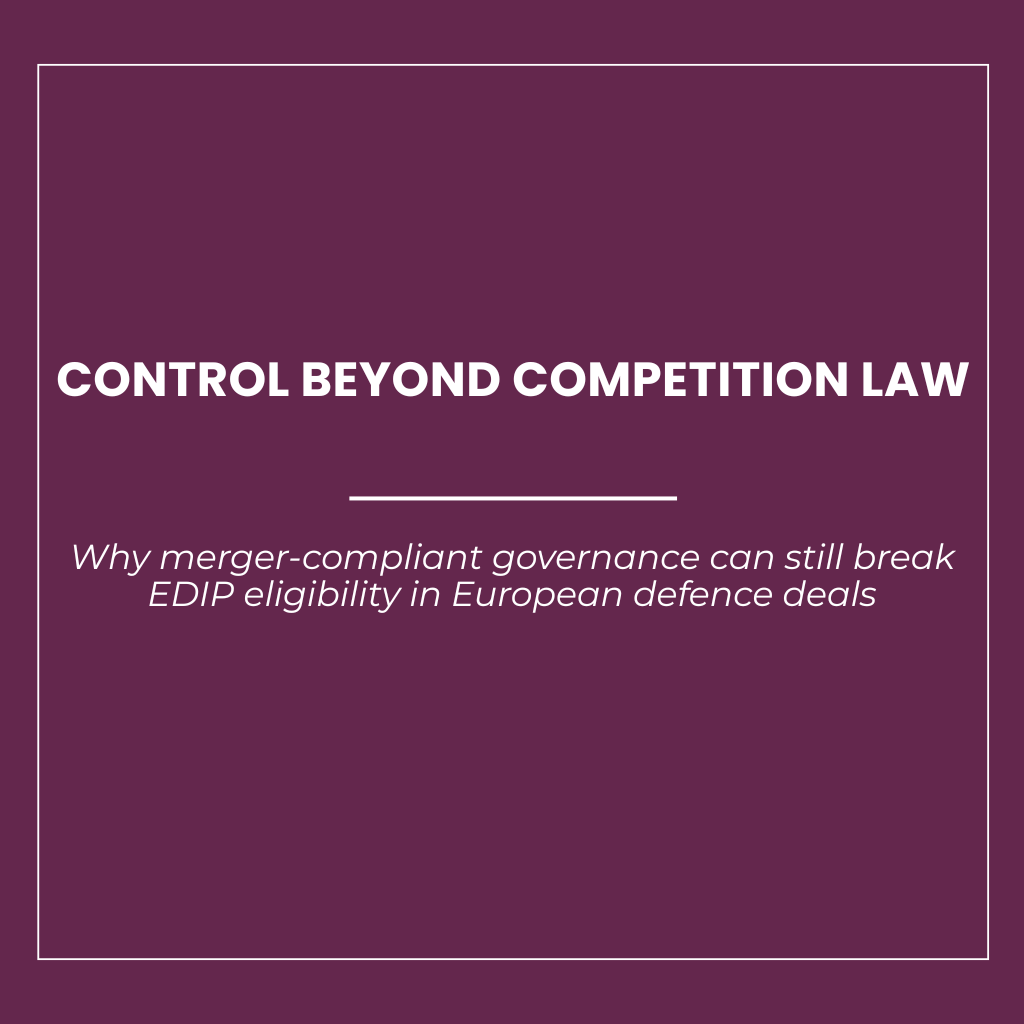 This report reconstructs the concept of control under EU merger control and under EDIP using only official legal sources, and then analyses their divergence in legal function and transactional impact. It proceeds in four analytical steps. First, it defines control under the EU Merger Regulation and the Commission’s jurisdictional guidance, with particular attention to minority rights and veto structures. Second, it reconstructs EDIP’s eligibility framework, focusing on third-country control, executive-management location, and operational autonomy over assets, infrastructure, and intellectual property. Third, it compares the two regimes across governance dimensions, explaining why identical rights can produce different legal consequences. Fourth, it derives implications for transaction structuring, private-equity governance, consortium positioning, and capital allocation, including the role of derogations and the interaction with foreign investment screening. The report concludes by identifying the governance features that create the highest divergence risk and by clarifying how EDIP reshapes the effective boundaries of control in European defence transactions.
