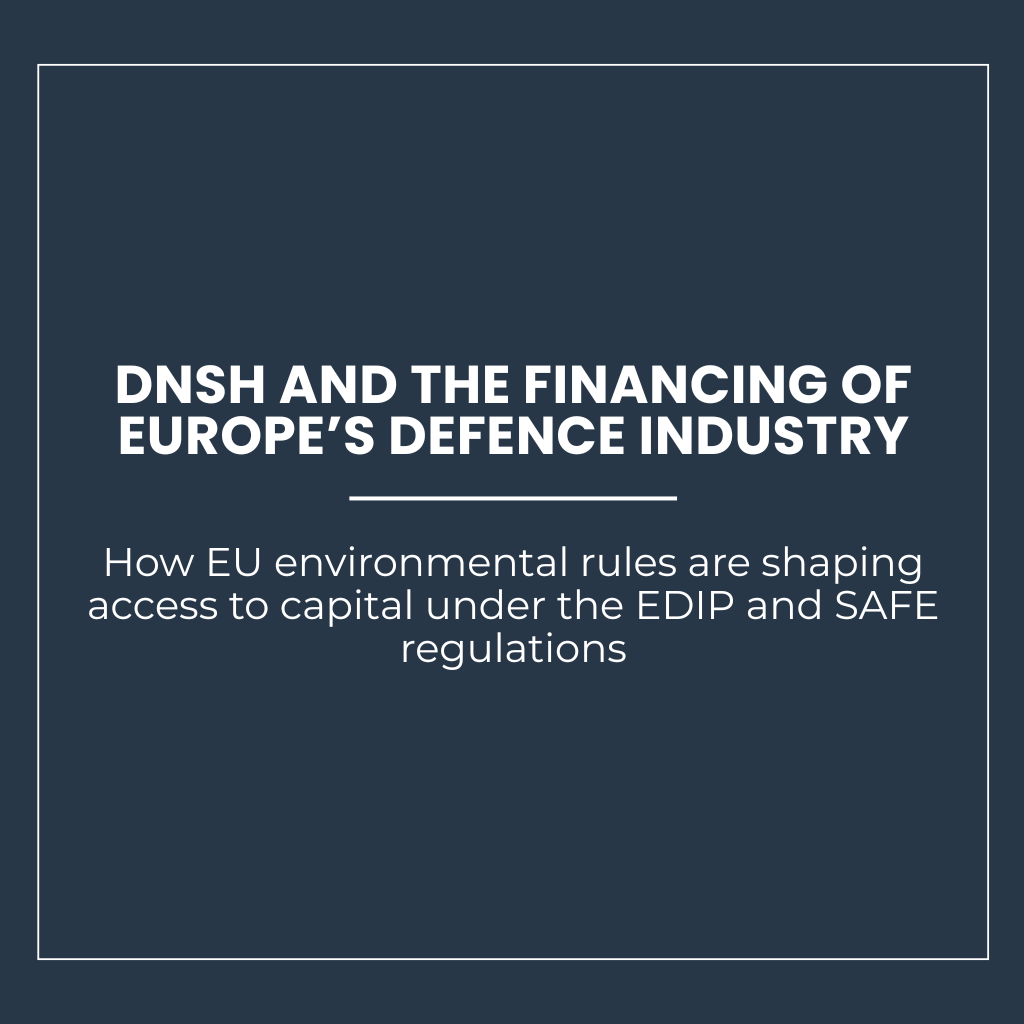 The rapid expansion of European defence investment is occurring within a regulatory environment that is profoundly different from previous rearmament cycles. Unlike earlier periods of military build-up, the current wave of defence spending in Europe is embedded within the Union’s broader framework for sustainable finance and environmental governance. This creates a structural question for governments, industry, and financial institutions alike: whether the regulatory architecture designed to guide the green transition can coexist with the urgent need to expand defence industrial capacity. The present report addresses this question by examining how the “Do No Significant Harm” (DNSH) principle, originally developed within the EU sustainable finance framework, is increasingly shaping the financial viability of defence industrial projects across the Union.