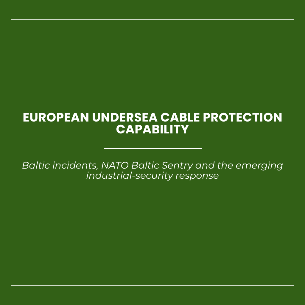 The report is structured as a Defence Finance Monitor mapping of this emerging capability domain. It first reconstructs the documented incident timeline from 2022 to 2026, separating technical facts, official statements, investigation status and unresolved attribution. It then analyses NATO’s Baltic Sentry, the European Commission’s Cable Security Action Plan, the CER and NIS2 legal framework, and the wider capability gap across maritime domain awareness, seabed monitoring, underwater robotics, sonar, fibre-optic monitoring, AI anomaly detection, emergency repair and public-private coordination. The final part assesses implications for defence primes, subsea firms, cable operators, infrastructure investors, insurers, regulatory counsel, auditors, procurement agencies, NATO, EU institutions and Baltic coastal states, before identifying concrete signals to monitor in procurement, regulation, industrial partnerships and future incident investigations.