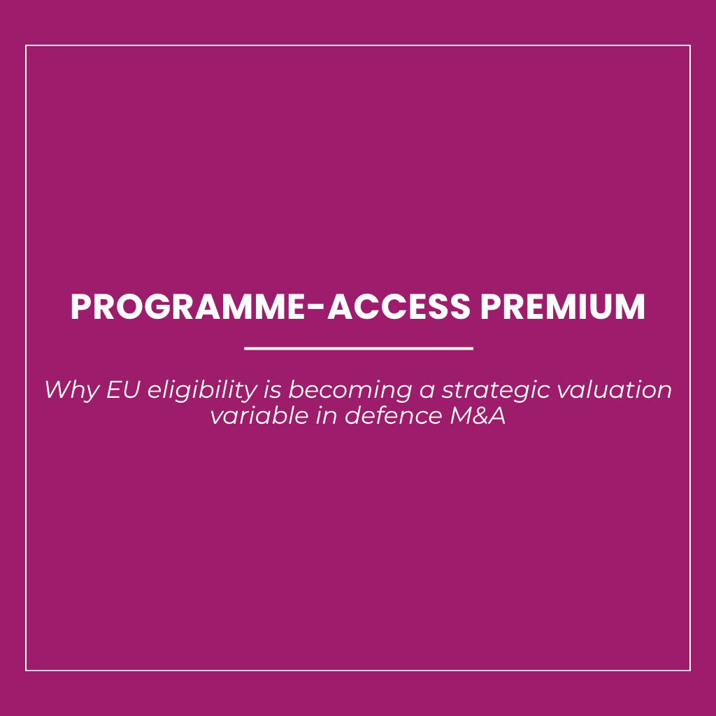 European defence M&A is entering a phase in which value can no longer be assessed only through technology, backlog, manufacturing capacity, customer access, or export-control compatibility. A further variable is becoming materially relevant: whether a target can remain within the eligibility perimeter of EU defence-industrial instruments after closing. The legal architecture of the European Defence Fund, EDIP, SAFE, and related frameworks increasingly links access to funding, procurement support, industrial partnerships, and exploitation rights to ownership, control, governance, and freedom from restrictive third-country influence. Yet disclosed transactions still rarely isolate that variable explicitly in valuation language. This creates a structural tension at the centre of the market: programme access may already be economically meaningful, while its pricing effect remains only partially visible in public deal evidence.