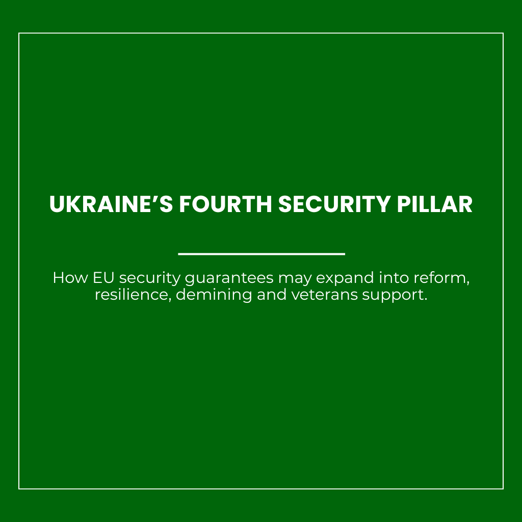 The European Union’s emerging “fourth pillar” of security guarantees for Ukraine marks a potentially significant shift in the way European support to Kyiv is being framed. It is not yet a codified legal instrument, a regulation or a dedicated funding facility. Its importance lies instead in the fact that the EU is beginning to define security guarantees beyond the established categories of military aid, macro-financial assistance and defence-industrial integration. By placing defence-sector reform, cyber and hybrid resilience, demining and veterans support within the same political architecture, the EU is signalling that Ukraine’s long-term security will depend not only on weapons and budgets, but also on institutional capacity, public-sector resilience, territorial recovery, medical rehabilitation and the reintegration of war-affected personnel.