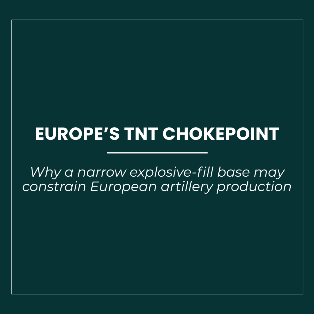 Europe’s effort to rebuild artillery ammunition output has exposed a structural vulnerability in the least substitutable part of the supply chain: the production of high explosives used to fill shells and warheads. This report examines whether the European ammunition ecosystem depends on an exceptionally narrow TNT base, how that dependency interacts with adjacent constraints in RDX, nitration infrastructure, precursor chemicals, permitting, energy, and filling capacity, and why the issue matters for ammunition manufacturers, defence ministries, and investors. The analysis treats the explosive-fill chain as distinct from the propellant chain and reconstructs the industrial architecture of the bottleneck rather than discussing ammunition production in generic terms.