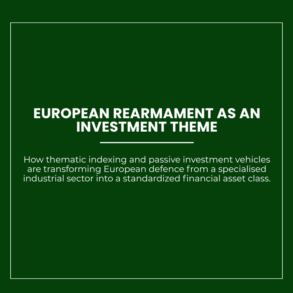This report examines the mechanisms through which the European defence sector is being transformed into an investable financial category. It begins by analysing the geopolitical and macroeconomic conditions that have revived defence as a central investment theme in Europe. The analysis then explores how index providers define the universe of defence-related companies and how thematic indices translate industrial and technological capabilities into measurable exposure criteria. The report subsequently examines the role of ETFs as financial infrastructure that distributes these indices within regulated investment frameworks and expands access to defence exposure across institutional and retail portfolios. Finally, the analysis evaluates the broader implications of this process, including the interaction between defence investment and ESG frameworks, the role of capital markets in supporting the European defence industrial base, and the emergence of what can be described as the indexation of European rearmament.