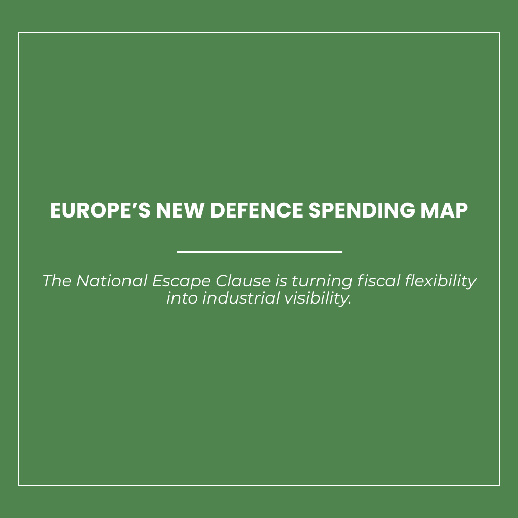 The National Escape Clause is no longer a technical adjustment within the EU fiscal framework. It is becoming a structural variable in the formation of European defence demand. By allowing selected Member States to deviate from their approved expenditure paths for defence spending, the clause is creating a differentiated fiscal geography: some countries now have formally recognised budgetary headroom for military procurement, while others remain outside that framework or rely on parallel instruments such as SAFE. The central issue is not simply whether Europe will spend more on defence, but where that spending will be most visible, most predictable and most capable of supporting industrial planning between 2025 and 2028.